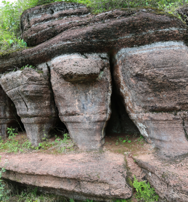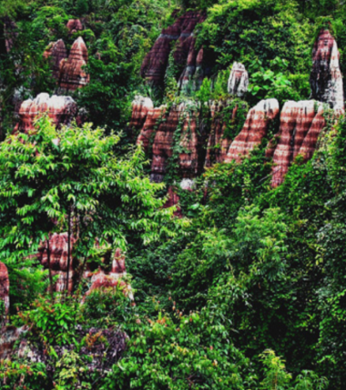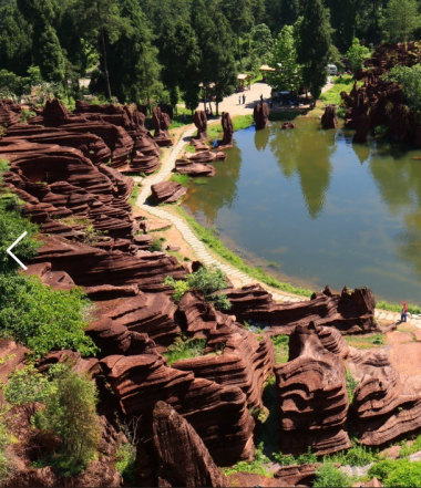 The red stone forest isdeveloped in the Ordovician Dawan Formation (O1-2d) andGuniutan Formation (O2-3g). Lithologically , it is made up of medium-thick layered purple-red mixed with gray-greennodular argillaceous limestone.Covering an area of about 13.9km2, the red stone forest is distributed in a gentle slopeareawith a slope of 15°~25°. It is formed bysubsoil erosion and surfacedifferentialweathering.The three main typesare dissolutiongrooves and fissures, which run in a direction of 287°, 65° and 27°. The stone forests areofvarious shapes,such as flame, tower, sword,andwall, etc. The stone forest occurs around the depressions and slopes.In some areas are developed dissolved pores, and the stone forest is 5-20 m high. |