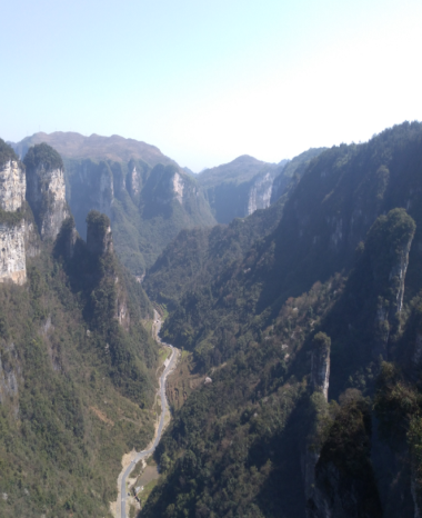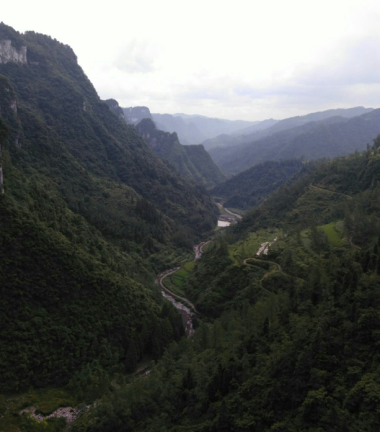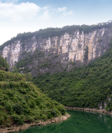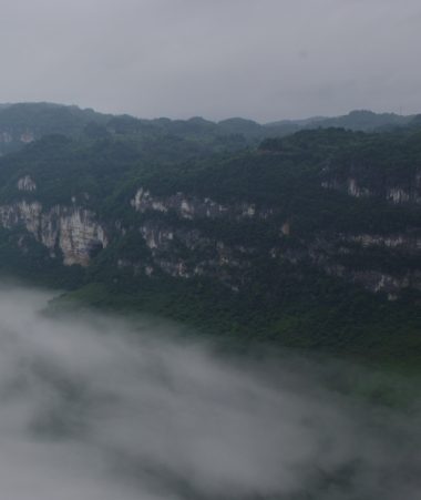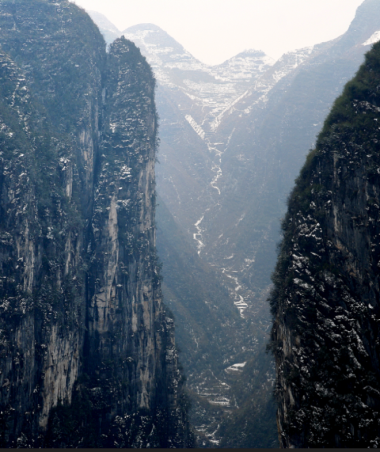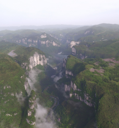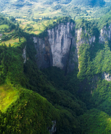 Dehang Canyon Group consists of Xinzhai River Valley, Pailiao Canyon, Jiulongxi Canyon and Yuquanxi Canyon. It is developed in Chefu Formation (Є3-4c), Aoxi Formation (Є3a), and Qingxudong Formation (Є2q). in the Cambrian system. Lithologically, it is made up of gray thin layer – medium and thick layer limestone, argillaceous banded limestone and dolomite mixed with shale. The Xinzhai River Valley is about 4.4km long, with a valley floor width of 50-180m, and a longitudinal slope of 0.007. It has a slope of 35°-55° on both sides of the canyon, and vegetation is developed. The world-famous Azhai Super-large Suspension Bridge is built above the Xinzhai River Valley, and on the southern side is developed the Sisters Rock Pillar group. Pailiao Canyon is about 3.6km long, generally running in a direction of northeast. The valley floor is 100-180m wide. The mountain massifs on both sides of the canyon are steep , with a relative altitude of 200-260m. The Jiulongxi Canyon is about 2.2km long, running in a direction of 306° to the northwest. The valley floor is 80-150m wide. The mountain massifs on both sides of the canyon are steep, with a relative altitude of 160-350m, a drop of about 165m, and a longitudinal slope of 0.075. Mountain rock pillars are developed on both sides of the canyon. Pangu Peak and Yinlian (Silver Chain) Waterfall occur in the area. The Yuquanxi Canyon is about 1.8km long, generally running in the direction of 68° to the northeast. The valley floor is 100-150m wide. The slope of the mountain massifs on both sides of the canyon is 30-50°, with a relative altitude of 100-260m. Tectonically, the Dehang Canyon Group lies on the horst between the regional Malichang Fault and the Guzhang-Jishou Fault. The secondary structures are extremely developed. The rainwater erodes and dissolves along the joints, fissures or fractures. With the uplift of the Earth’s crust, the linear valley becomes deepened. The bedrock on both sides of the cliff collapses towards the free surface due to weathering,, eventually forming the Dehang Canyon Group where rock walls and rock pillars are developed.