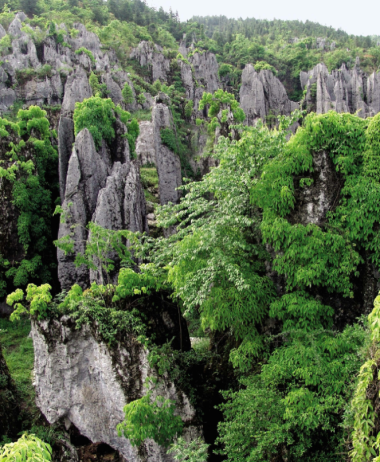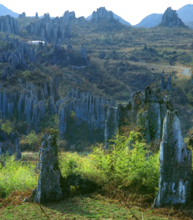 Thestone forest is located in the Middle Permian Maokou Formation (P2m). Lithologically, it is dominated by thick limestone, whichcontains richFusulinid and coral fossils. The stone forestcovers an area of about 3km2.They are distributed individually or in groups. The stonepillars are of various shapes, such ascone, column, cone, sword, wall,andcurtain, etc. They look likehumanbeings or objects, such asCrocodile Biting,Overturned Boat,ImmortalFinger,Lovers,Killing Demon,Stone Gate. The individualstone column is generally 5~15m high anda small amount of them are more than 15m high. The fissures and jointsare developed inthe Xigou Stone Forest in the Luota synclineshaft area. The fault structure isalsodeveloped, mainlyrunningin the north-east direction and the north-west directions. The stone forest is formed by water flow eroding and dissolving along the joints andfissures. |