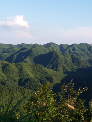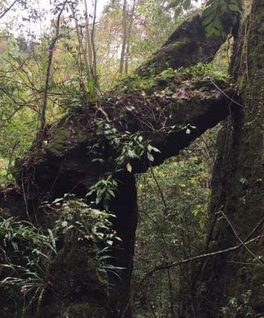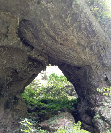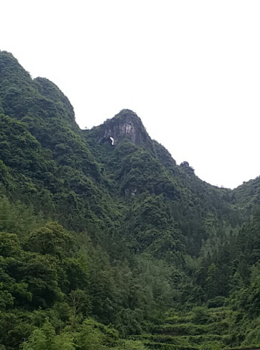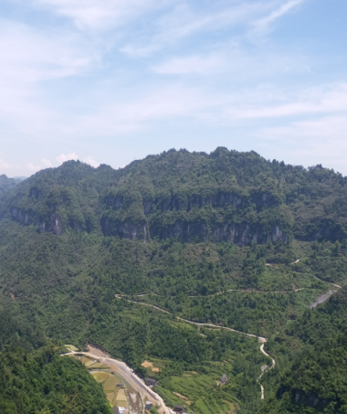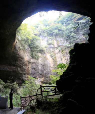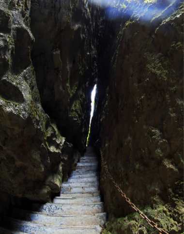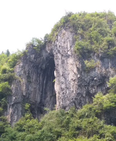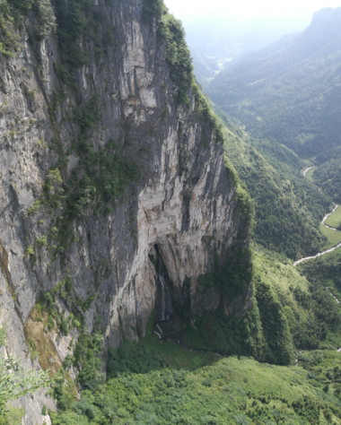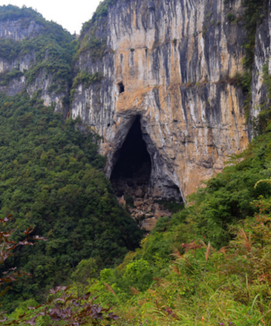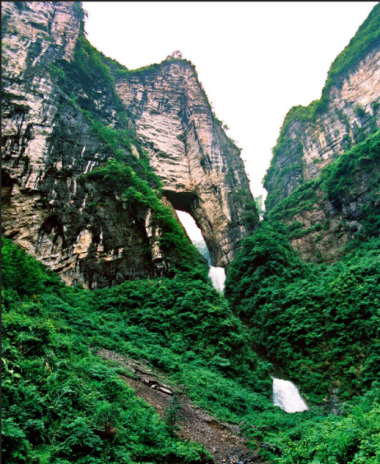 Lüdong Mountain Light through Cave is located at the edge of the DongmakuPlatform.While its lower part ismade up of shale mixed with limestoneinCambrian Shipai Formation (Є1-2s), the upper partconsists of gray-dark gray, thin-medium thick layerpowdered crystalline limestoneinthe Qingxudong Formation (Є2 q). Lüdong Mountain is a rock-wall typed light thorough cave incised by two canyons. The rock wall is located at the top of Mount Agong at an altitude of 1227m. It is 60-70m high and 130-150m long, running in a direction of 300°,and is 4~30m thick.Two light through caves are developed in the mountain, which run in a direction of35°. The largelightthroughcave is about 25m high, 8m wide and 4m deep;whilethe smallone is about 10m high, 5m wide and 4m deep. The twocaves are erected in parallel across the mountain, resembling thesemi-inverted Chinese character "Lü". Thelight through caves are formed due to the erosion, dissolution and incision of early formedkarst caves bynorthwest-running water flow during the later crustal uplift process, and some ofthese caves are left over to form thelight through caves.