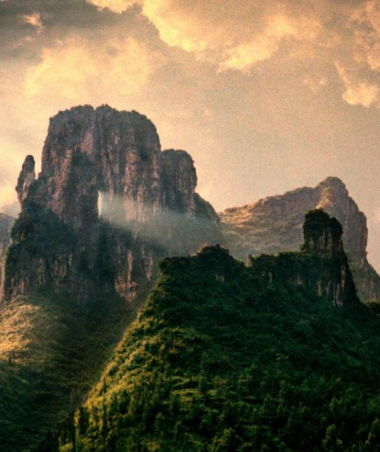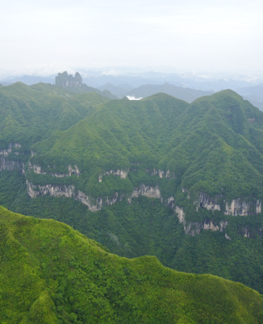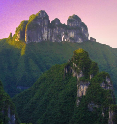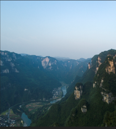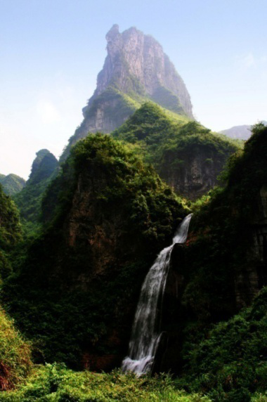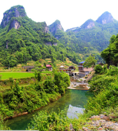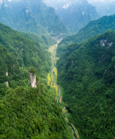 Mengdong River is the first-class tributary of theYoushui River. Lithologically, the exposedrocks are mainlymade up of the gray thick layer of crystalline limestone, the dolomitic limestoneinOrdovician Tongzi Formation (O1t) and Honghuayuan Formation (O1h),as well as gray-white, very thick-block dolomite in the Cambrian Loushanguan Formation. (Є3-4l). The valley extendsin a direction ofnearly north-south, and is about 42km long from Yongshun Countytothe intersection of Youshui River. There are many cliffs in thevalley,whose height is generally 150-200m,andthe highest is more than 400m. The valley is "U"-shaped, with many caves, waterfalls and stalactites along theriver bank. Thelargest waterfallismore than 80 metershigh, with an overflow widthof more than 10 meters.Peak clusters and strange rocksare developedon both sides of thevalley, mainly including theGoddessPeak, Meeting Peak,Menglang Peak, LotusRock, andGeneralRock.