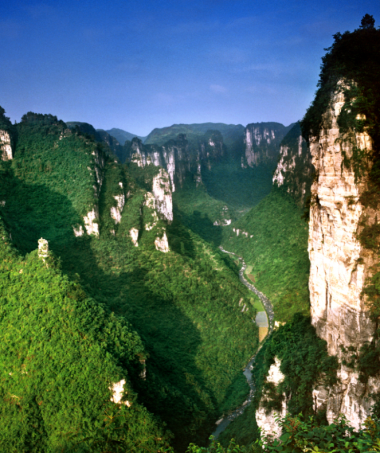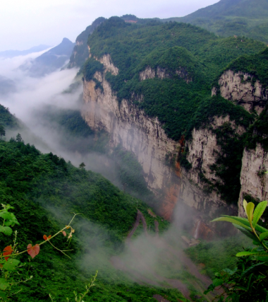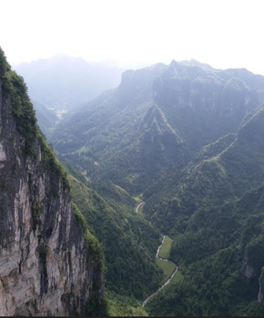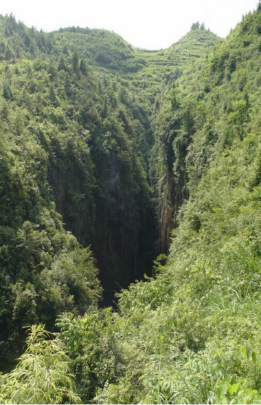 The valley is developedin the CambrianBitiao Formation (Є4b). Lithologically, it is made up of medium-thick layer ofdolomitic limestone and limestone. Thevalley is 7.8km long. It windsfrom near north-south to 120° northwest, before iteventuallyturns to near east-west direction.It has a valley shoulder widthof 200-400m, valley floor width of 60-200m, anda depthof 100-300m. The cliffs in the valley are steep. It is “U”-shaped,dolines and sinkholes are developedonplatforms onboth sides of the valley. The valley isoften shrouded with mist, deep and serene, and the vegetation is developed. SanmendongValley area lies on the horst between Malichang Fault and the Guzhang-Jishou Fault. Flowingwatererodes and dissolvesalong the joints and fissures or fractures, and the basement rocks on both sides of the cliff wall collapse towards the free surface to form the valley. |