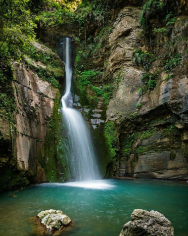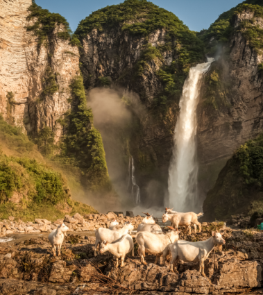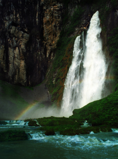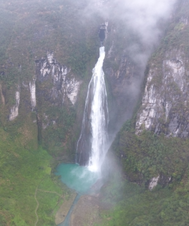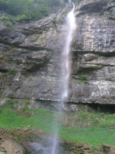 Jianduoduo Waterfall isdeveloped on the strata in the Upper and Middle- Cambrian Chefu Formation(Є3-4c),Lithologically, the rocks are made up of thin-thick layer of gray-black limestone. The waterfallhas a drop ofas high as 236m,and an overflow widthof 1-4m. It is a seasonal waterfall, whose flowranges from 0.27m3/s in dry season to 50m3/s during the flood season.Below the waterfall is a water pool with a water depth of 1-8m and a pool area of about 120m2. The water is crystal clear, and flows fast, with a large potential energy. Itpours down from the overflow hole into the deep pool below,with a roaring sound and great momentum,before it flows into the Niujiao River. |