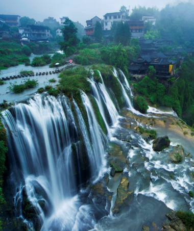 Furong Town Cascaded Waterfall is located near the intersection of YanluoStreamandYoushui River, in the corescenicarea of Furong Ancient Town, andthe southeast wing of the Shuiyin-Xiangjiazhai Syncline.Due to the impact of structural movement, some parts of the waterfall have slight folds.Structuralfissures running in the direction of 40° and295° aredeveloped.Lithologically,the waterfall isexposed on medium-thick layered bright-grained sandy limestone and gray dolomite in the Bitiao Formation (Є4b),while its lower part is exposed on thin layer of powdered crystalline limestone and argillaceous limestone. The waterfall is divided into twostages,with a distanceof 23m between the twostages. The firststage has a drop of 20m and an averageoverflow width of 50m, while the second stageis divided into three sections with a drop of about 33m and an average overflowwidthof 60m. During the flood season, the waterfall has a large amount of water and the overflow width can reachup to70m. The lower part of the waterfall was originally a karst cave. Later, due to the collapse of the roof of the cave and the erosion of the northwestwardfissures, a steep ridgewas formed, and the riverwater poured down to formthe waterfall. Apart frommany cave collapsed deposits, somestalactites still remain below the steep ridge. |