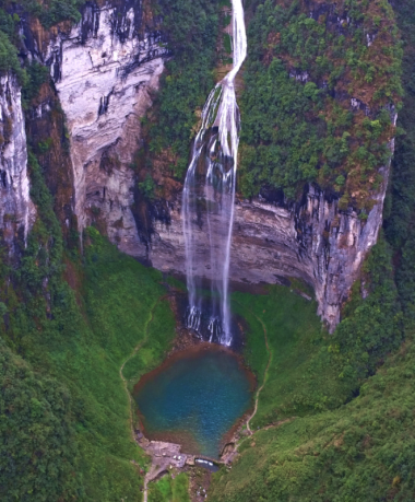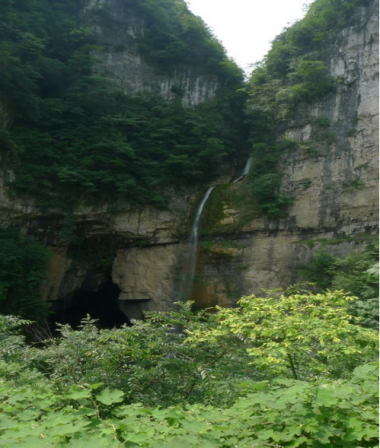 The waterfallconsists of nine cascades, which havea total drop of about 100 meters. The underground river flows out from the TianguotanCave andpours down the cliff wall.Lithologically, the exposedrocks are made up of limestone, mixed with dolomitic limestone andlumpsiliceous limestoneinthe middle-Permian Maokou Formation (P2m). Itbottom ismade up ofSilurian shale, sandyshale,sandstone,siltstone, and quartz sandstone.Topographically, the waterfall is located in the valleyrunning in a direction of north-south. The bottom of the valley has a big drop and many stages, forming many waterfall and water pool landscapes.Within a short-distancein the upper partare formednine waterfalls, hence it is called Jiupuxi (literally meaning Nine Waterfalls) Waterfall. The waterfall is exposed near the boundary between the Permian carbonaterocksand the Silurian sandy shale. The bottom sandy shale is awater-resistant layer. The groundwaterchanges to horizontal movement when it moves to this interface and is exposed on the cliff wall to form a suspended waterfall. |
