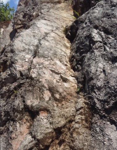 The karst cave is developedin the Middle Permian Maokou Formation (P2m).Lithologically, it is made up of very thick layer of limestone and dolomitic limestone. The cave is 38m high and 15~20m wide, leading to theRuishi Villageatthemountainback. At the entrance of the cave a large number of falling rocks formed by collapse can be found. The maximum size is 8×6×6m3. The jointsand fissures of rock, as well as many small caves are developed. The cave runs in a direction of 320°. The cavesturns narrow when visitors enter60m inside the cave. A fracture can be seen in the cave, which is arc shaped. The fracture zone is 1.5~2m wide, whose direction is essentially consistent with that of the cave.. The stalactites and stalagmites are notwell developed in the cave. The cave is formed by the erosion and dissolution of ground water along the fault, and collapse of the rocks.
