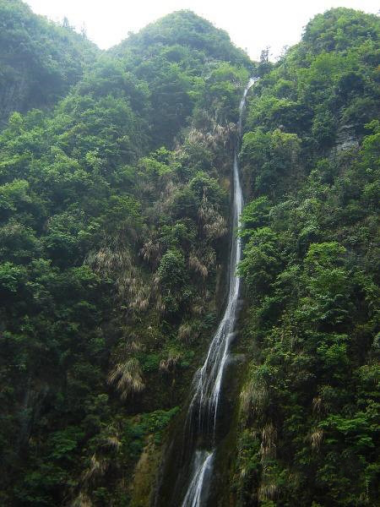Jiulong (Nine Dragons) Waterfall is located in the left gully of the JiulongxiValley.It is developed in the CambrianChefu Formation (Є3-4c). Lithologically, the stratumismade up of thin layer ofargillaceous banded limestone. The waterfall has a drop ofabout 180m, and anoverflow width of 2-5m. It looks like a silver curtain,with crystal clear water. Below the waterfall is a water pool, which covers an area of about 40m2,and has adepthof about 40cm,with crystal clear water. The waterfallhas a flow of about 3-50L/s,and flows intoJiulong Stream.Yinlian (Silver Chain) Waterfall is anoutlet of anunderground river. Jiupuxi Valley is formed due to structure, and under the joint actions of erosion, dissolutionand bedrock collapse. The underground river moves from higher to lower areas, and is blocked by valley and then exposed to formthe waterfall. |