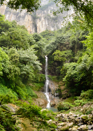 Liusha Waterfall, located at the sourceareaof JiulongxiValley, is exposedon the layer of the Cambrian Chefu Formation(Є3-4c).Lithologically, the rocks are made up ofdark gray thin-medium thick layer of argillaceous banded limestone and sandy dolomitic limestone and carbonaceous argillaceous limestone. The waterfallhas a drop of90m and anoverflow widthof 10~15m.At the bottomis a round water poolcalled Jiulong Pool, which hasa diameter of about 50m and a water depth of 2~4m. During the flood season, the waterfalls pour down from the cliffs and look extremely spectacular. During the dry season, the stream floats down like aflowing yarn, looking graceful and striking. Hence, the waterfall is named Liusha (literally meaning flowing yarn) Waterfall. |