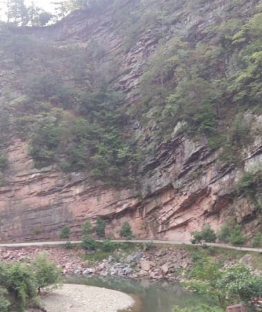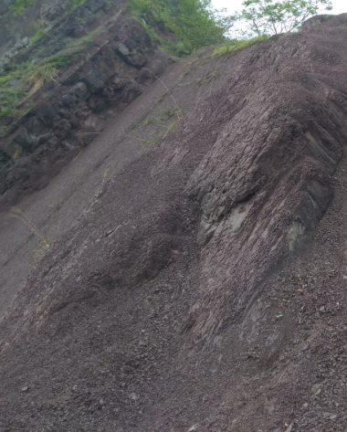 The 600m-long section is an unconformity between the Permian and Silurian systems.Its upper part is exposed in shale, carbonaceous shalemixed withcoalbed in the mid-Permian Liangshan Formation and thick, laminatedlimestone and dolomitic limestone inQixia Formation,andMaokou Formation; while its lower part is exposed inSilurian sandy shale, argillaceous mixed with sandstone. Devonian and Carboniferous strata areabsent between the two parts,showing disconformity or slight-angleunconformity, which is an important evidence for the uplift of the Caledonian and Hercynian tectonic movements. The upper limestone is hard, where vertical joints and fissures are developed. The lower Silurian sandy shale is a kind of soft rock,which suffers from severe weathering, making the upper limestone lose its support. The rock massinclines along the joints and fissures towards the free surface to form a collapse relic. |