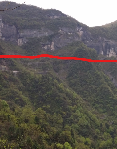 Mengxi River Valley is developed inthe Permian (P) and Silurian (S) strata, and thevalley runs mainlyin a direction ofnorth-northeast. It is about 3km long, and 10-30m wide at the bottom. The cross section is "V" shaped and 200-500m deep.Both sidesof the valleyare steep,although there aresomedifferences.The east side is steep, with an average slopeof 30-50°.In some parts the slope islarger than 50°. The upper part of the west side is a continuous karst cliff wall, which is150-260m high. The cliff wall is nearlyupright, with a slope of 30-50° from the cliff to the valley. Cliff walls are mainly developed about 700m on the west side of the northern part of the valley.The cliffs are mainly fault-based cliffs, where the tectonic traces such as scratches, steps,secondary fractures and joints can be found.At early stage, the river valley was subject to the erosion, and dissolution of flowing water along fractures; while in the later stage, it was mainly affected by erosion and washing of water after it had penetrated through the limestone layer.