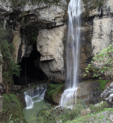 Leigong CaveSuspended Waterfallisdeveloped in the CambrianChefu Formation (Є3-4c). Lithologically, its rock formation is made up of thin-medium thick layer of argillaceous banded limestone and dolomitic limestone. The waterfall is theoutlet of the underground river of Shuanglong Platform, and high-angletensile joints and fissuresare developed along the underground riverin a direction of northeast 10°. The waterfallhas a drop of about 200m, and aflowof0.5-1.0m3/s,with crystalclear water.No water poolcan be seenbelow the waterfall, and the waterof thewaterfall flows intoJinlong Valley along the gully. The flowing water continues to erode anddissolvealong the fault, causing thevalley to continuouslybecut and widened. Finally, the underground river is cut off, exposed on land surface to form asuspended waterfall. |