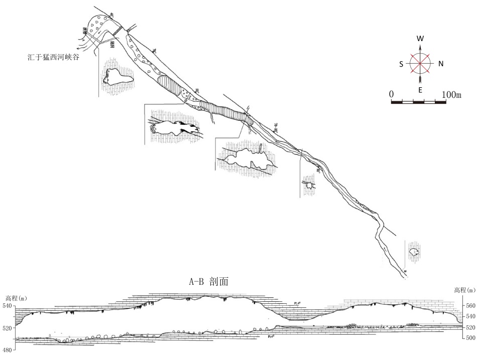 The cave walls in the lower layer are regular and straight, serving as the drainage channel. The cave bottom in the middle layer is over 10m wide, and 10-15m high, with uneven walls and development of branch caves. The cave bottom in the upper layer is 10-25m wide, also with uneven walls and development of small branch caves. Many blue holes and headcuts occur in the cave. While the heacuts are often 5-6m high, the blue holes are 1-7m deep. There are seven large blue holes, which are generally 20m long, 15m wide and 4m deep, with the maximum length of 120m and depth of 6-7m (Figure 4-33). A small amount of speleothems including stalagmite, stone curtain and stalactite, are developed in the cave. The cave body often has a large size. Outside the cave there are some famous scenic spots, such as Luota Platform and Cliffs, and Diaoshuikan Waterfall, which have high values in viewing and popular science education.