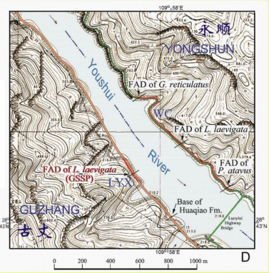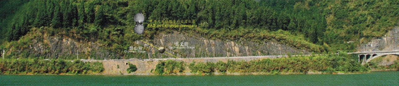 Luoyixi Section , where the GSSP for Guzhangian Stage in the Cambrian System is located, starts from the lower boundary of Drumian Stage, and ends at the lower boundary of Paibian Stage , with a total length of about 880m. The core part of the GSSP section is about 260m long. The GSSP Section lies in the stratum of Huaqiao Formation, while Lejopyge laevigata which defines the lower boundary of GSSP for Guzhangian Stage, is situated at 121.3 m above the lower boundary of Huaqiao Formation.