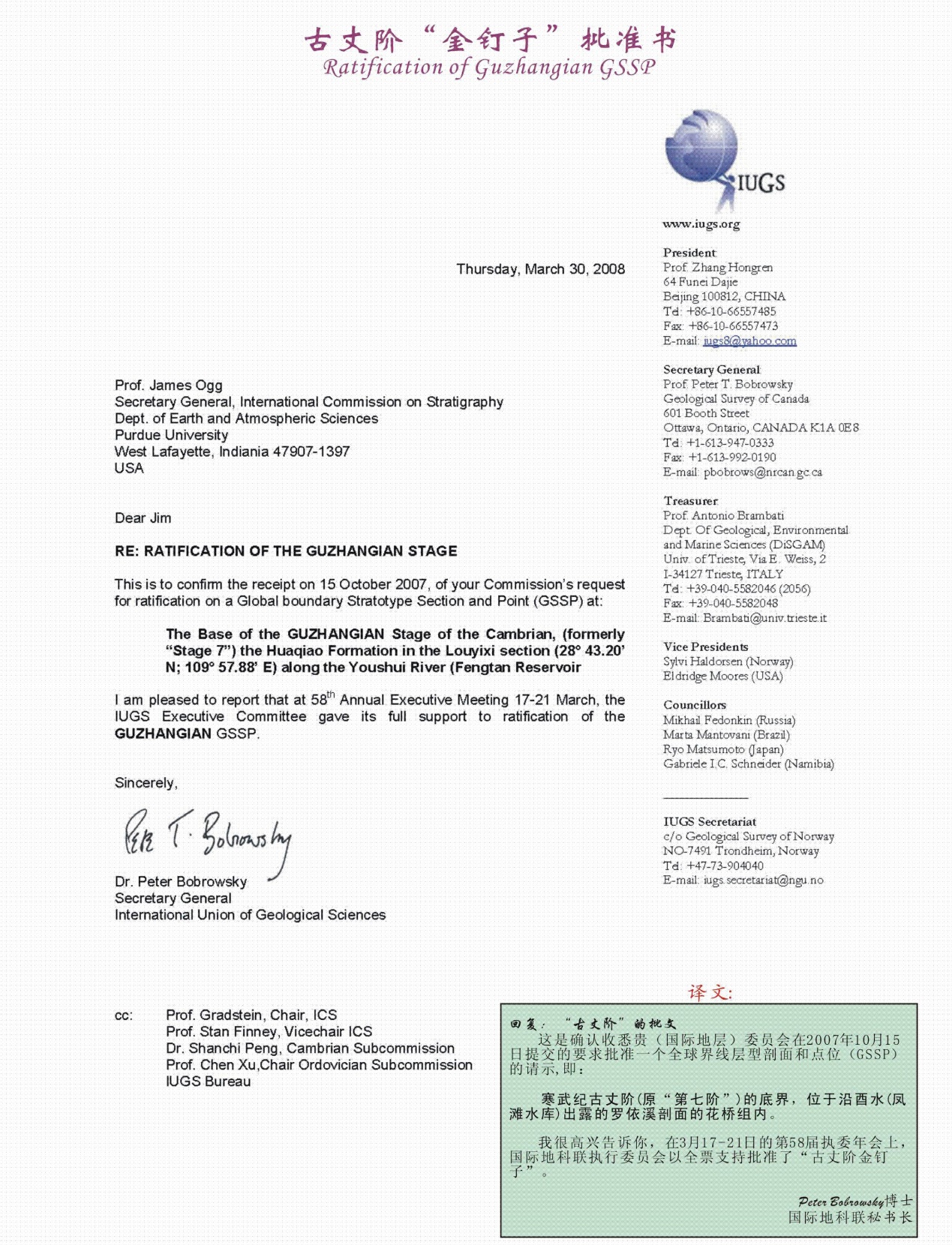 The Executive Board Meeting of IUGS was held in Morocco in March 2008. In the first round of voting of the Working Group of the International Subcommittee on Cambrian Stratigraphy, the candidate Luoyixi Section defeated the candidate section of Kazakhstan with a 100% of votes to become the only candidate strategraphic section. It was approved with another 100% of votes in the subsequent two rounds of voting by the International Subcommittee on Cambrian Stratigraphy and International Commission on Stratigraphy, which approved to establish the lower boundary GSSP of the 7th Stage of the Cambrian system in Guzhang County, Hunan, China, and to name the stage with Guzhang County, where the strategraphic section is located.