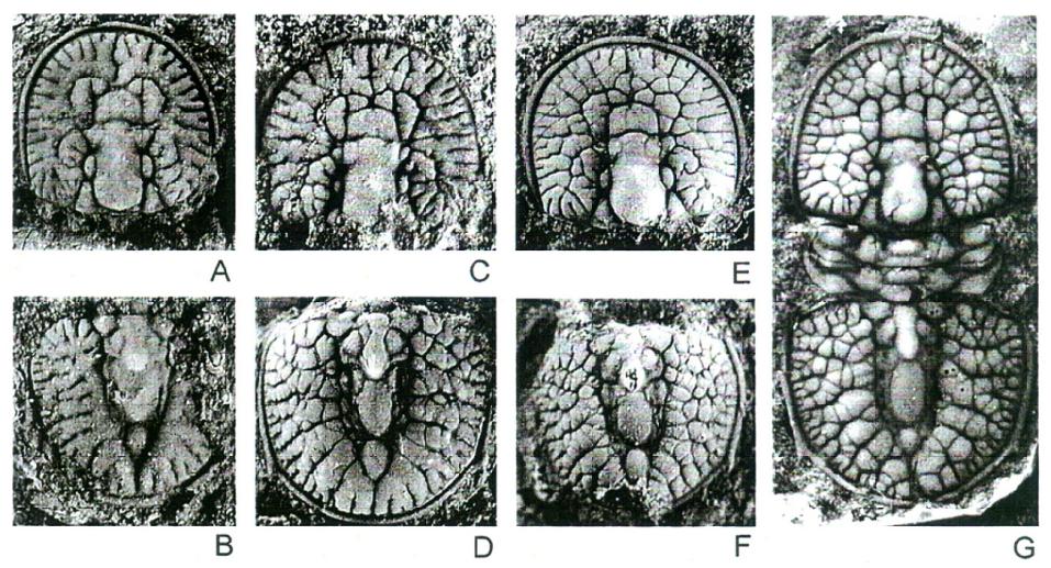 Most of Agnostida of the section of Paibian Stage were widely distributed around the world, and the section shared the same FAD point with Glyptagnostus reticulates. Below the point was 7.56m-thick formation (G.stolidotus zone) containing Glyptagnostus stolidotus, which featured radial grooved pattern instead of reticular pattern at the buccal part of the head and the rib part of the tail (see Figure 1-16A-B); immediately above the point first appeared the relatively primitive type of Glyptagnostus reticulates,i.e., the previously considered “subspecies” - G.reticulates angelini, which featured reticular shape of some grooved patterns (rear buccal part of the head and the front of the tail (see Figure 1-16C - D); further above was Glyptagnostus reticulates whose grooved patterns became more complicated as the grooved patterns at the whole buccal part and rib part were reticular (see Figure 1-16E-G), i.e., the previously considered subspecies G.reticulates reficulatus. Therefore, the bottom points of Furong Series and Paibian Stage were in the successive sequence of evolution from Glyptagnostus stolidotus to Glyptagnostus reticulates (see Figure 1-16A-G).