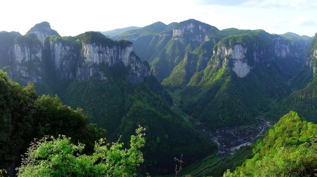 Located in Dehang Miao Ethnic Village, Jishou City, Dehang Grand Canyon is 15 km long, 900-1300m wide and 300-430 m deep. It is generally flat and box-shaped (Figure 5-7). The canyon is constrained by two groups of tensional fracture extending in north-northeast and northwest directions, and is shaped in a crisscross pattern in Dehang Miao Ethnic Village. Together with the secondary gorges, they combine to form an X-shaped canyon group, consisting of Hangxia Valley, Xinzhaihe Valley, Jiulongxi Valley, Jidou Valley and Yanxi Valley. Within Dehang Grand Canyon are developed many middle and small scaled fractures, joints and fissures, rock walls, and rock pillars. At the end and cliffs of the canyon are also developed a few waterfalls, which are often misty and look like a fairyland.