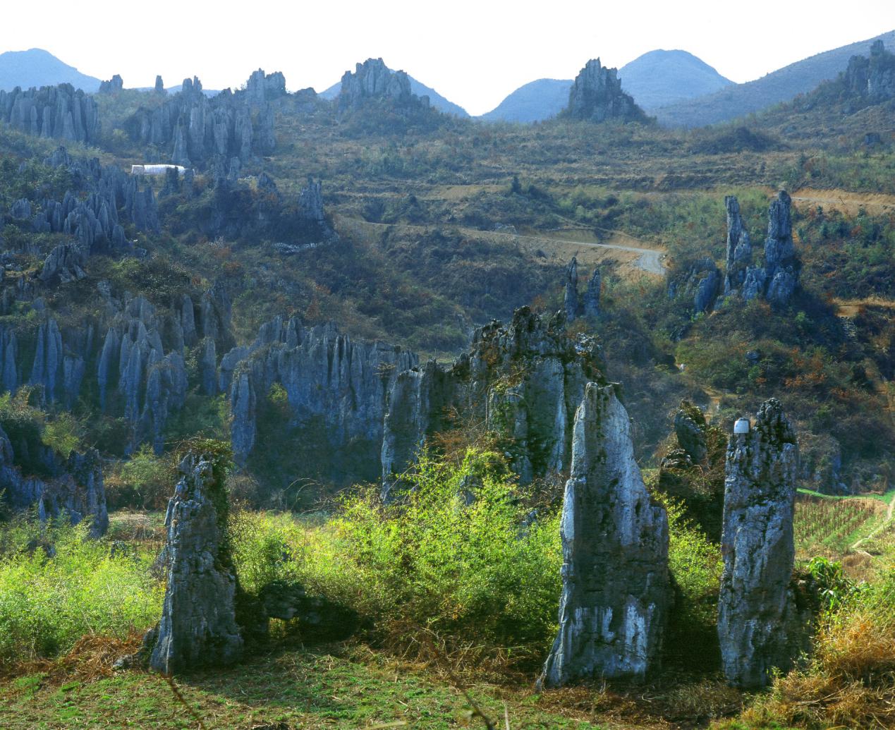 Situated in Dingjiatai Village, Luota Township, the Stone Forest covers an area of about 2.5km2. While it is concentrated besides flat gullies, it is sparsely distributed on slopes. It is generally higher than 15m, and can reach 30m high, with a diameter of more than 20m. As it is shaped like five tigers chasing after six sheep, it is called the Stone Forest of Five Tigers Chasing after Six Sheep. The stone forests are of different shapes, such as people, objects, sword, etc. (Photo 4-87).