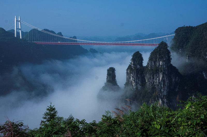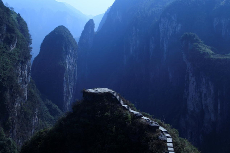 Tianwen (Questioning Heaven) Platform, also called “Arranging Battle Platform”, is located in the central part of the canyon. It is a round platform with a diameter of 6m, and an elevation difference of 300m with the valley bottom. Stone steps that lead to the platform are built along the karst wall. On the two sides of the platform stand steep canyons, and several waterfalls pour from the cliffs. It looks misty and majestic, and is known as a rare natural viewing platform over Dehang Grand Canyon (Photo 4-93).