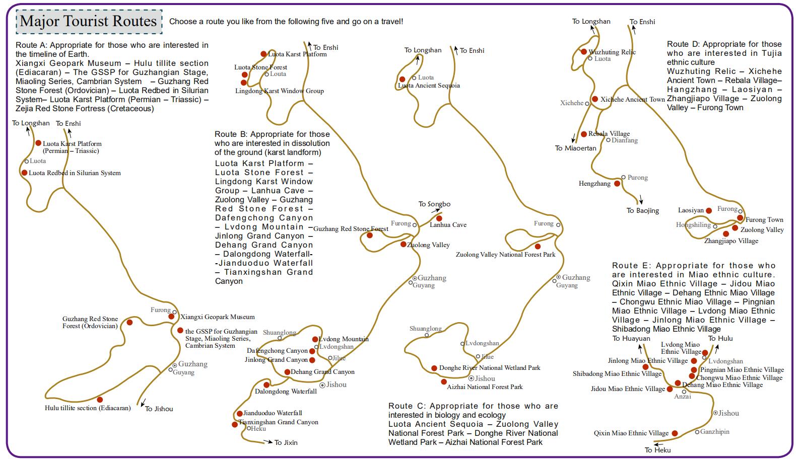 Xiangxi UNESCO Global Geopark Museum – Hulu tillite section (Ediacaran) –The GSSP for Guzhangian Stage,Miaoling Series,Cambrian System – Guzhang Red Stone Forest (Ordovician) – Luota Redbed in Silurian System– Luota Karst Platform (Permian – Triassic) – Zejia Red Stone Fortress(Cretaceous)