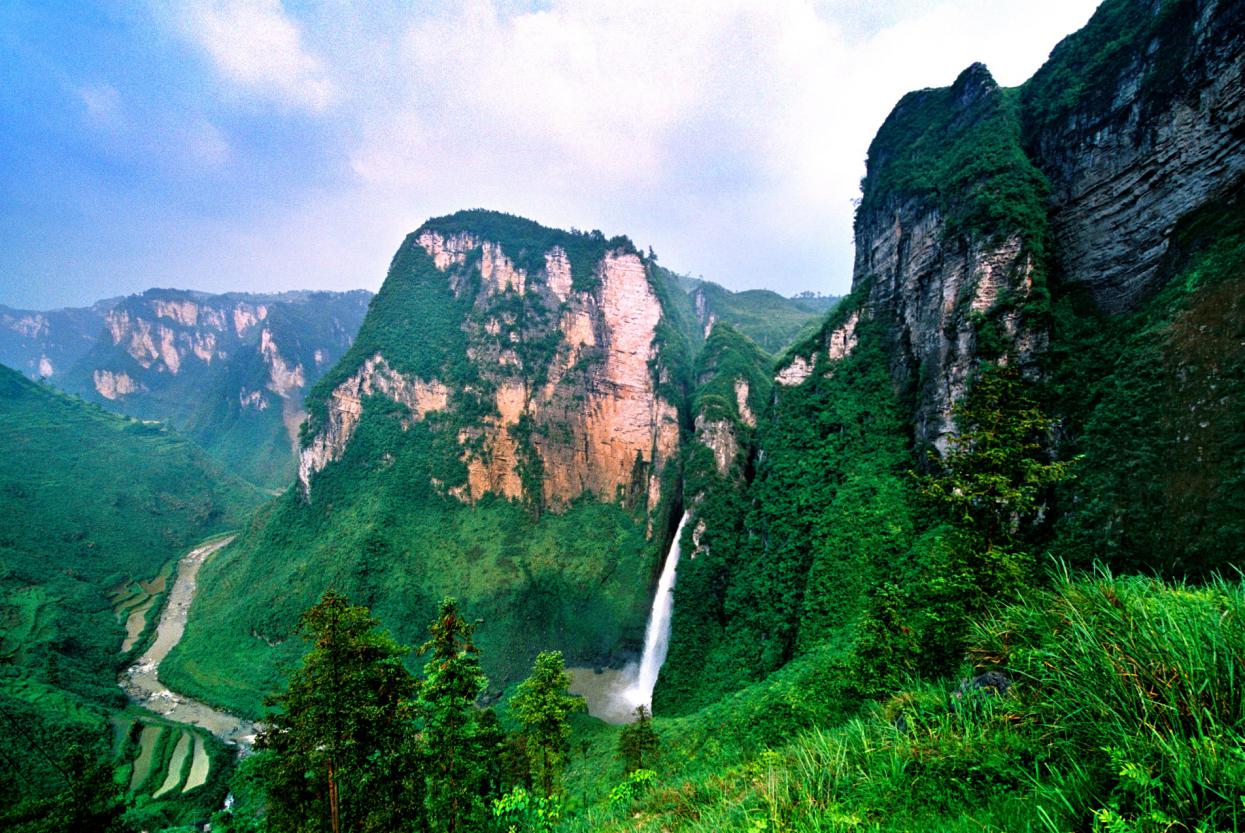 Situated in the north of Hepai Village, Liubao Township, Fenghuang County, Hunan Province and the southern end of Niujiao River Valley, Jianduoduo Waterfall has an overflow width ranging from 8-20m and a drop of 236m, which is the waterfall with the largest drop in Hunan Province. It is a seasonal waterfall, with the water flow ranging from 50 L/s in the dry season and 643 L/s in the flood peak period. During the flood season, the waterfall roars down the mountain top with great momentum. In low water period, the mists formed by trickles linger in the air, which looks exceptionally beautiful. Below the waterfall is a pool full of crystal clear water, which has an area of 1200m2 and a depth of 1-8m. The waterfall pours into the pool from the overflow vent with loud noise, which looks very magnificent (Photo 4-67).