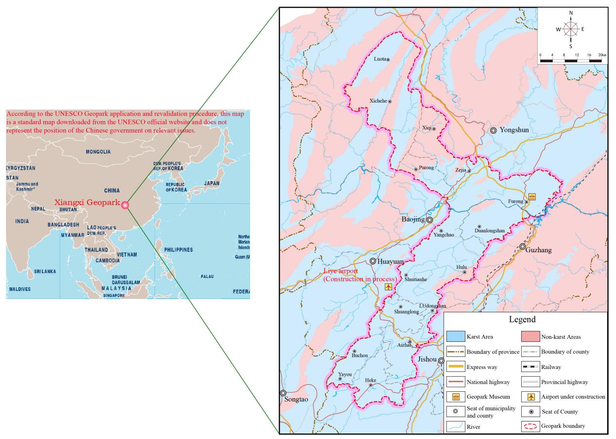 Xiangxi UNESCO Global Geopark (N28°06′49.23″—29°17′24.26″ and E109°20′13.66″—110°04′12.55″) is located in Xiangxi Tujia and Miao Autonomous Prefecture in Hunan Province, China, covering a total area of 2,710km2.