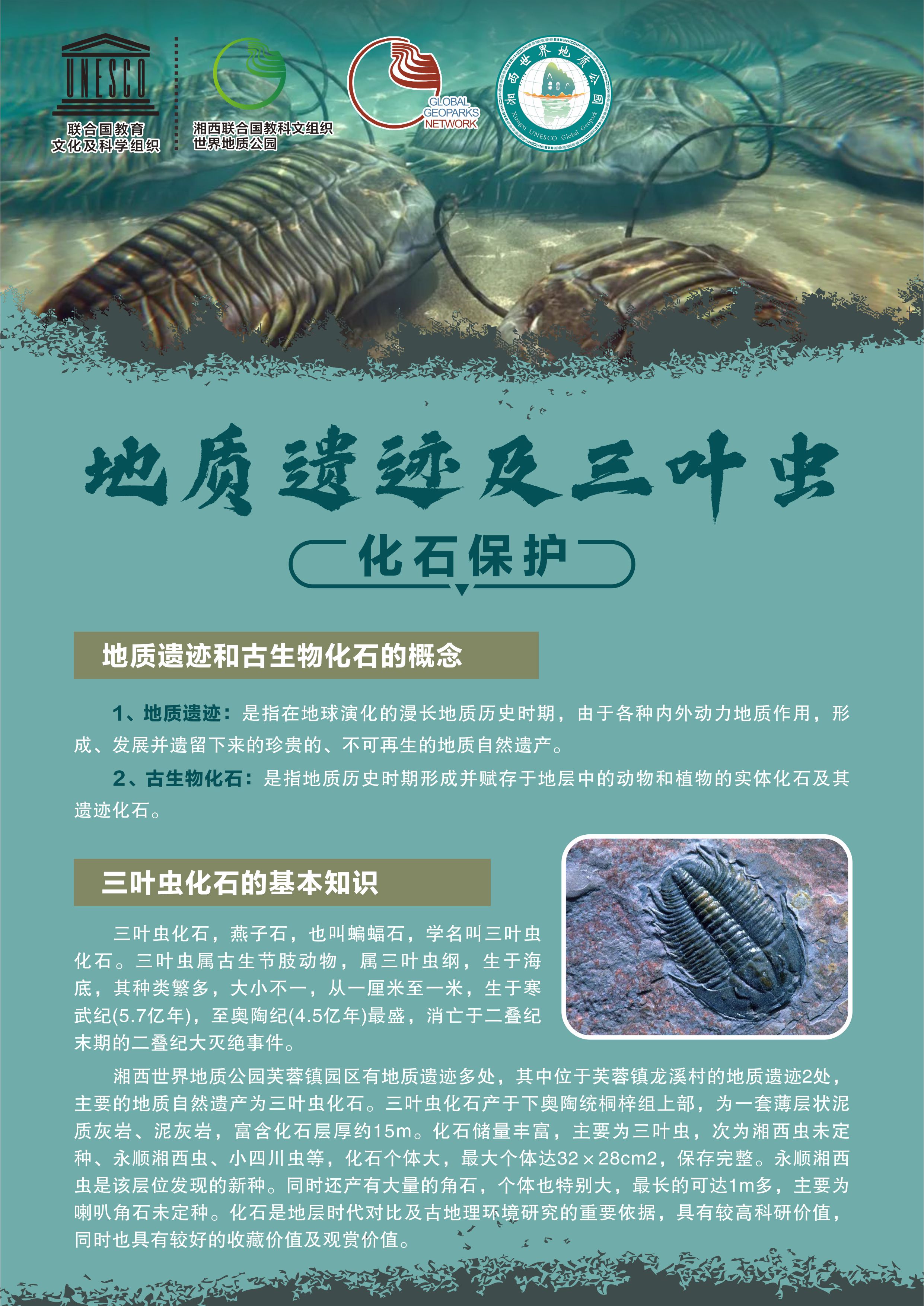 据悉,湘西世界地质公园具有重要地质遗迹点90处,分布在吉首、凤凰、古丈等7个县市,其中,Ⅰ级(世界级)地质遗迹点3处;Ⅱ级(国家级)地质遗迹点52处。在永顺县芙蓉镇龙溪村所分布的列夕奥陶系三叶虫化石群为Ⅱ级(国家级)地质遗迹点,其内也出土了全国最大的三叶虫化石之一,为古生物研究提供了可考证据。