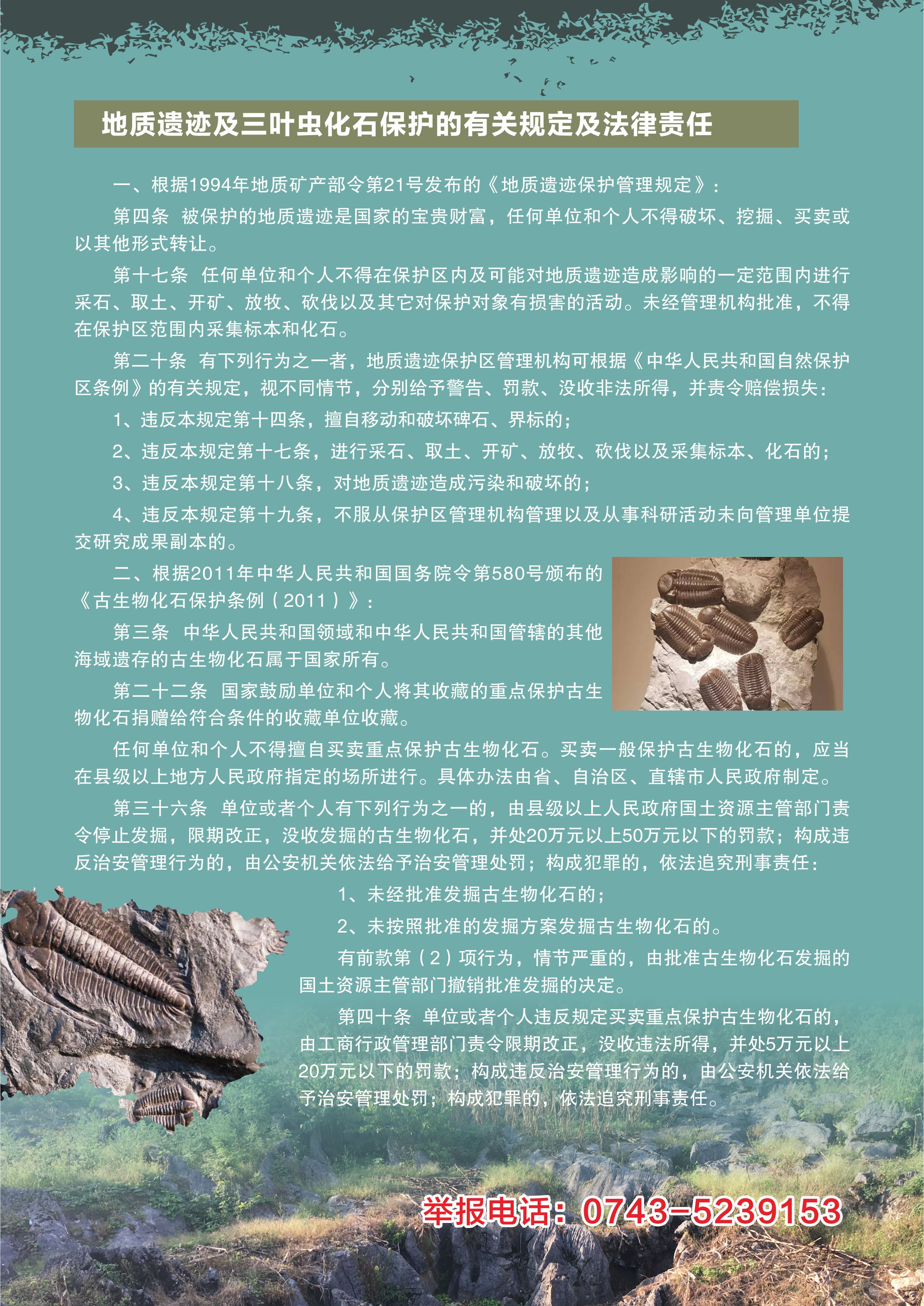 在龙溪村,举办单位组织召开了群众代表大会。来自州地质公园管理处、州地质公园博物馆、永顺县地质公园管理处的工作人员向与会群众宣传讲解了地质遗迹保护和三叶虫化石保护的重大意义、破坏地质遗迹和盗采三叶虫化石应承担的法律责任,以及我州关于地质遗迹管理和三叶虫化石保护的工作举措等内容,并现场发放了地质遗迹和三叶虫化石保护宣传单。