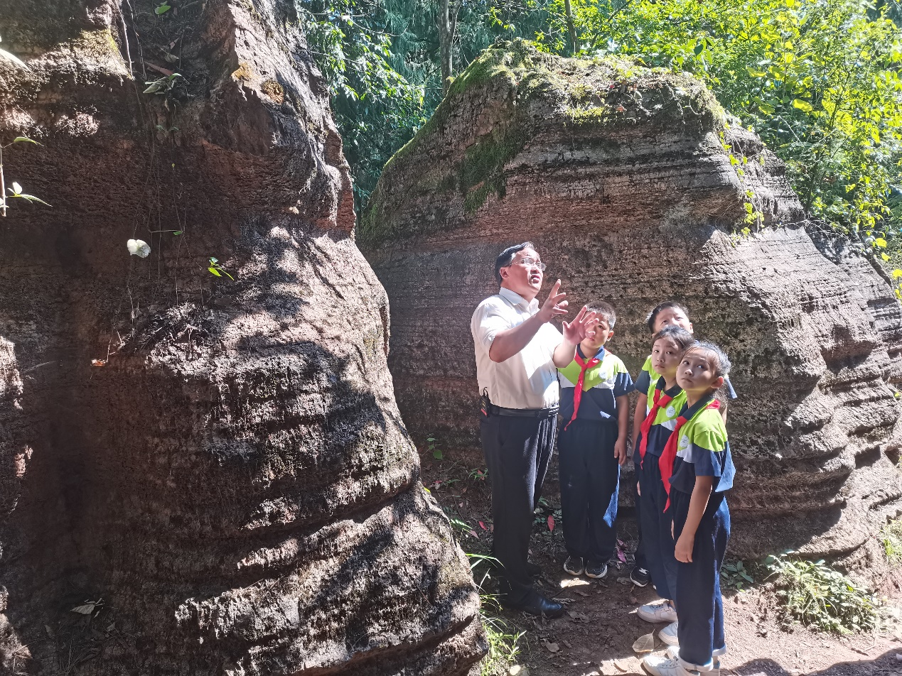 活动当天,徐世球教授从古丈阶“金钉子”到红石林,为永顺县芙蓉学校的学生们介绍了“金钉子”的由来与价值、红石林的具体成因、地质灾害的防治知识等,给孩子们带来了一场科普“盛宴”。