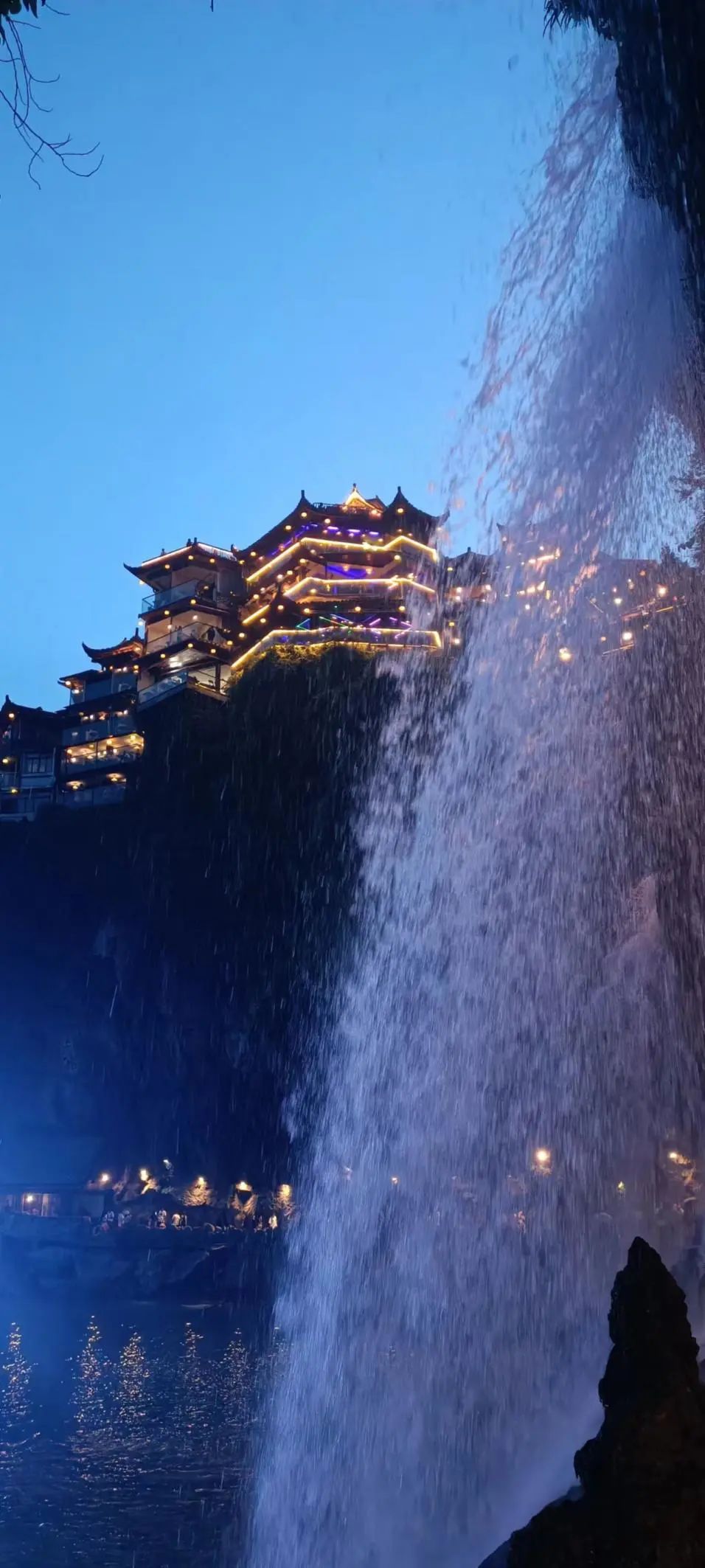 “叹古道旋,险峰多雾隐。欲飞渡,危崖千仞,临渊惊魂,《边城》氤氲。惟此地,烟霞袅袅,倩影婷婷。品茗观月,思而今,寨威名。仰塔索悬桥,彩虹穿陉,车似流星。胜境悠悠如幻,仙游客,醉词润心。把盏劝君留,共享苗家风情。”一桥飞架东西,天堑变通途。雾弥漫,赤红色矮寨大桥雄矗山崖。